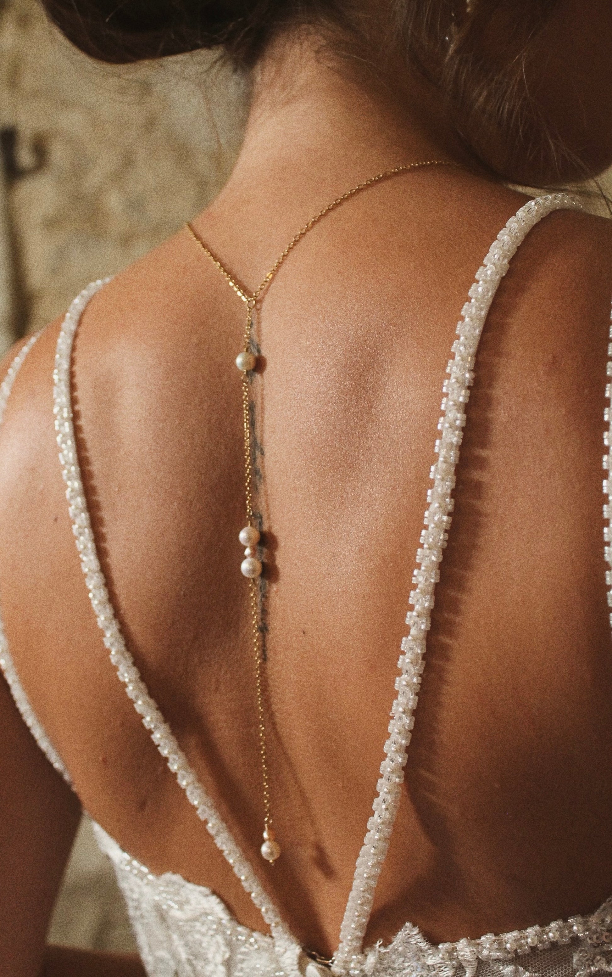 Bijou de dos à enfiler par la tête, conçu pour se porter avec un dos nu ou un décolleté plongeant.